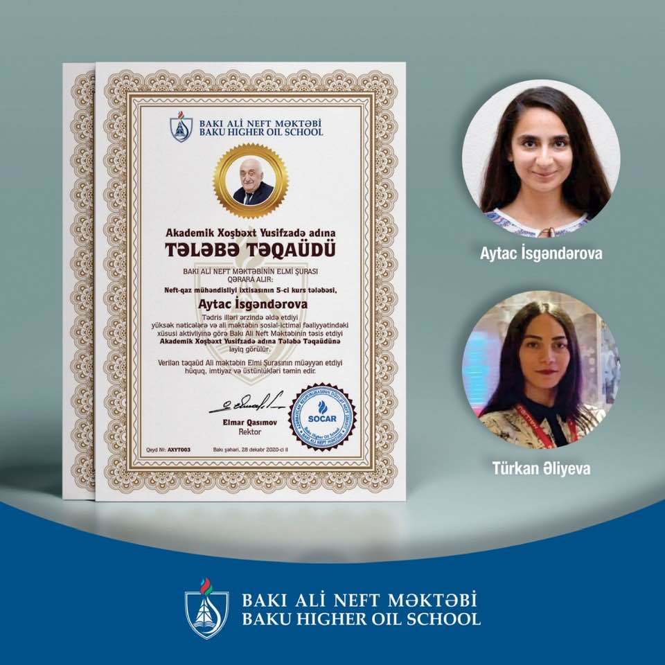 The student scholarship named after academician Khoshbakht Yusifzadeh was awarded to the 5th year students of the Petroleum Engineering Department of BHOS, Aytaj Iskenderova and Turkan Aliyeva, in accordance with the final performance indicators for the 2019/2020 academic year. These students showed the highest GPA and excelled in academics, behavior and extracurricular activities.