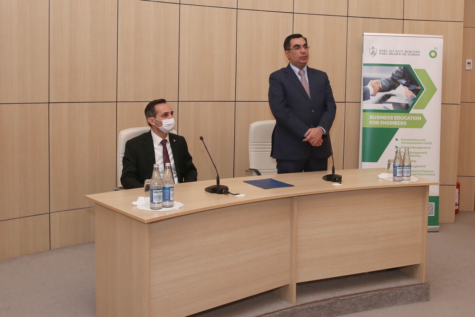 На церемонии, посвященной завершению очередного курса «Бизнес-образование для инженеров», присутствовали ректор Бакинской высшей школы нефти Эльмар Гасымов, менеджер по мероприятиям и бренд-коммуникациям компании BP Azerbaijan Заур Джабраил, а также окончившие курс студенты.