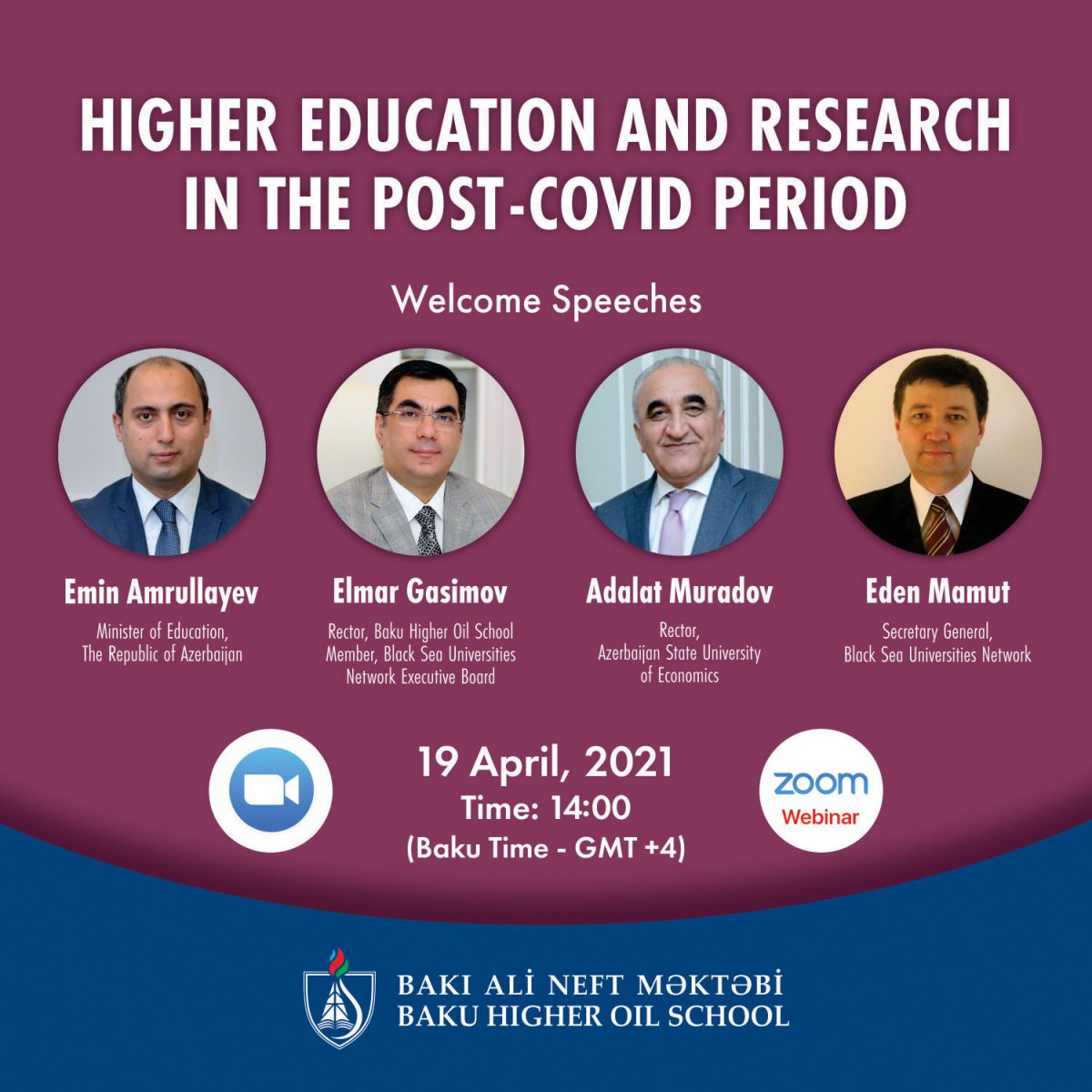 On April 19, 2021 at 14:00 (Baku time), the Ministry of Education of the Republic of Azerbaijan, Baku Higher Oil School and the Black Sea Universities Network will jointly hold a webinar on the topic "Higher Education and Research in the Post-COVID Period".