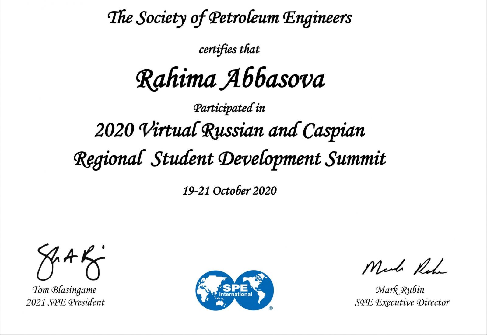 Bakı Ali Neft Məktəbinin (BANM) tələbəsi Rahimə Abbasova Neft-Qaz Mühəndisləri Cəmiyyətinin (SPE - Society of Petroleum Engineers) “Rusiya və Xəzər bölgəsi üzrə Regional Tələbə İnkişafı Sammiti”ndə iştirak edib. Tədbirdə Azərbaycan, Rusiya, Qazaxıstan və Özbəkistandan olan gənc mütəxəssislər, eləcə də tələbələr iştirak ediblər.