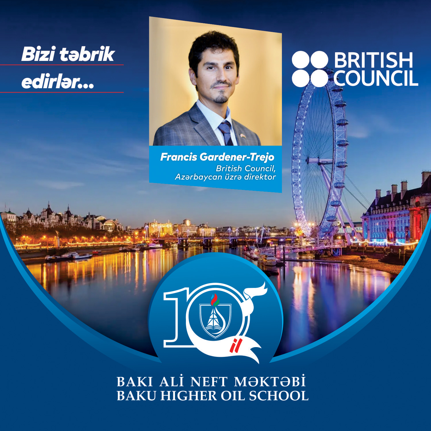 Bakı Ali Neft Məktəbinin yaradılmasının 10 illik yubileyi münasibətilə “British Council” təşkilatının Azərbaycan üzrə direktoru Fransis Qardener Trexo təbrik məktubu göndərib. Təbrik üçün ona təşəkkür edir və “British Council” ilə uğurlu əməkdaşlıqdan məmnunluğumuzu bildiririk.