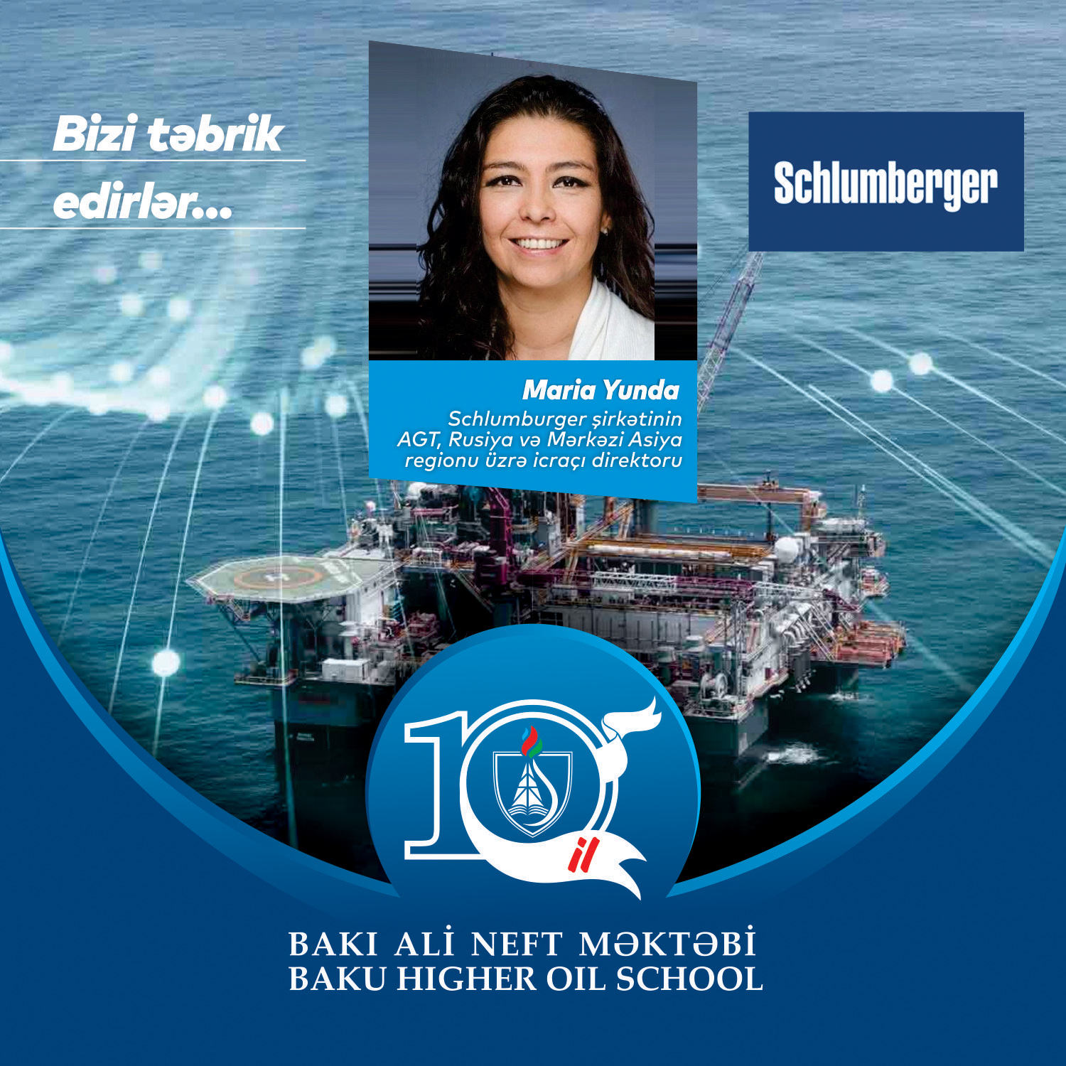 Bakı Ali Neft Məktəbinin yaradılmasının 10 illik yubileyi münasibətilə “Schlumberger” şirkətinin Azərbaycan, Gürcüstan, Türkiyə, Rusiya və Mərkəzi Asiya regionu üzrə icraçı direktoru Maria Yunda təbrik məktubu göndərib.Təbrik üçün ona təşəkkür edir və “Schlumberger” şirkəti ilə uğurlu əməkdaşlıqdan məmnunluğumuzu bildiririk.