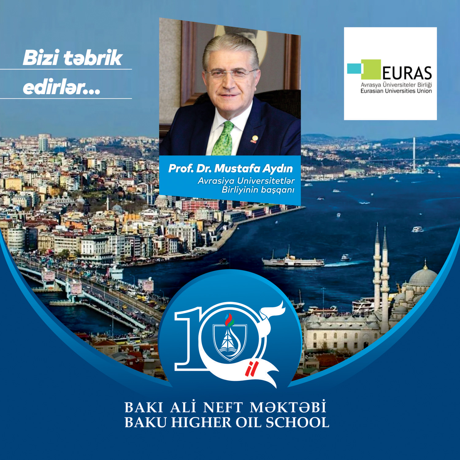 Bakı Ali Neft Məktəbinin yaradılmasının 10 illik yubileyi münasibətilə Avrasiya Universitetlər Birliyinin (EURAS) başqanı professor Mustafa Aydın təbrik məktubu göndərib. Təbrik üçün ona təşəkkür edir və EURAS ilə uğurlu əməkdaşlıqdan məmnunluğumuzu bildiririk.