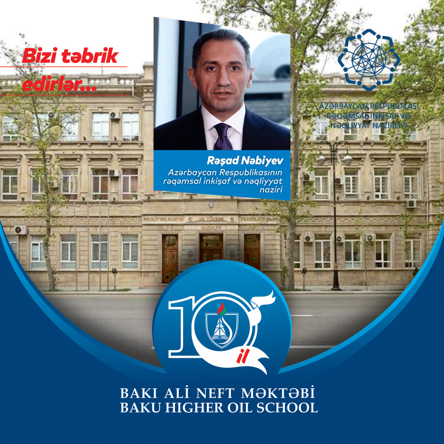 Bakı Ali Neft Məktəbinin (BANM) yaradılmasının 10 illik yubileyi münasibətilə Azərbaycan Respublikasının rəqəmsal inkişaf və nəqliyyat naziri Rəşad Nəbiyev təbrik məktubu göndərib. Təbrik üçün cənab nazirə təşəkkür edirik.