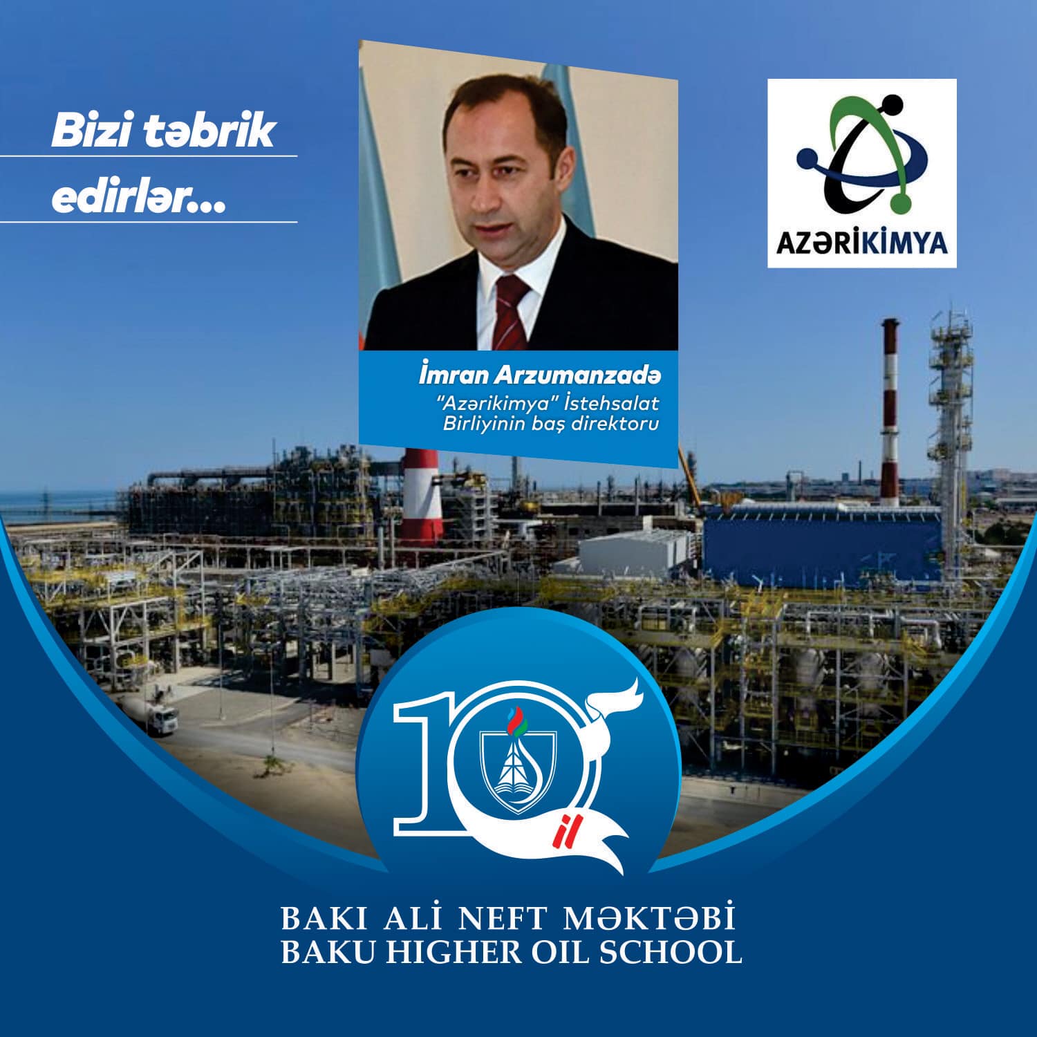 Bakı Ali Neft Məktəbinin (BANM) yaradılmasının 10 illik yubileyi münasibətilə SOCAR-ın “Azərikimya” İstehsalat Birliyinin baş direktoru İmran Arzumanzadə təbrik məktubu göndərib. Təbrik üçün cənab baş direktora təşəkkür edirik.