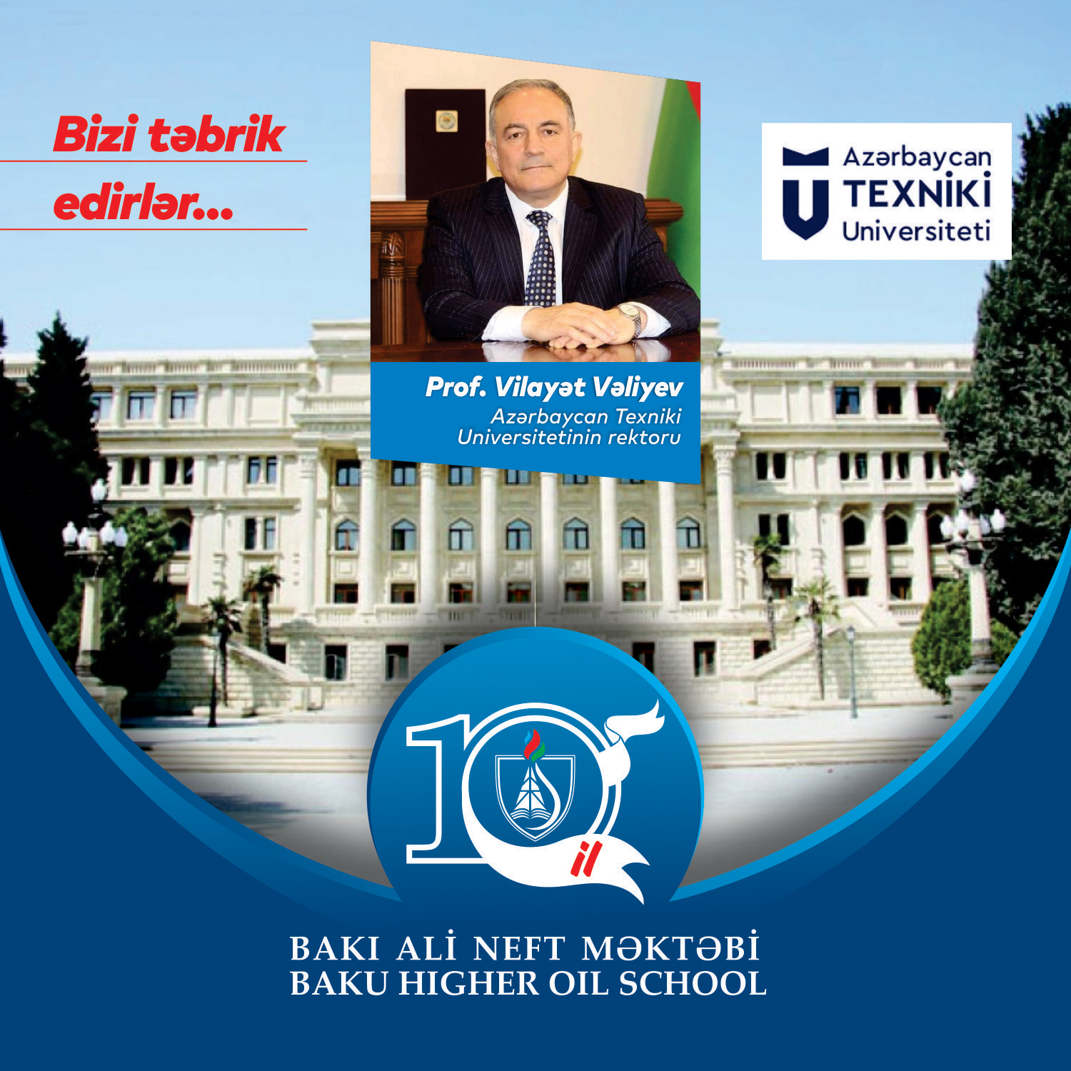 Bakı Ali Neft Məktəbinin (BANM) 10 illik yubileyi münasibətilə Azərbaycan Texniki Universitetinin rektoru, professor Vilayət Vəliyev təbrik məktubu göndərib. Təbrik üçün hörmətli rektora təşəkkür edirik.