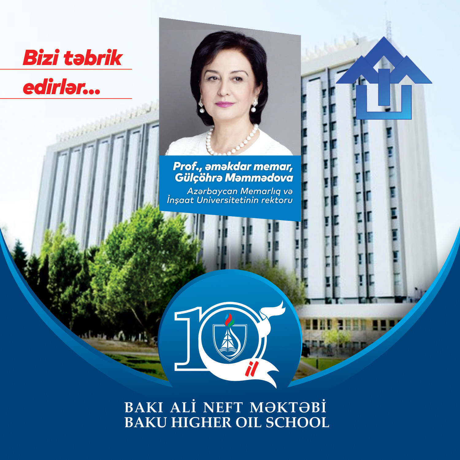 Bakı Ali Neft Məktəbinin (BANM) 10 illik yubileyi münasibətilə Azərbaycan Memarlıq və İnşaat Universitetinin rektoru, professor, əməkdar memar Gülçöhrə Məmmədova təbrik məktubu göndərib. Təbrikə görə hörmətli Gülçöhrə xanıma təşəkkür edirik.
