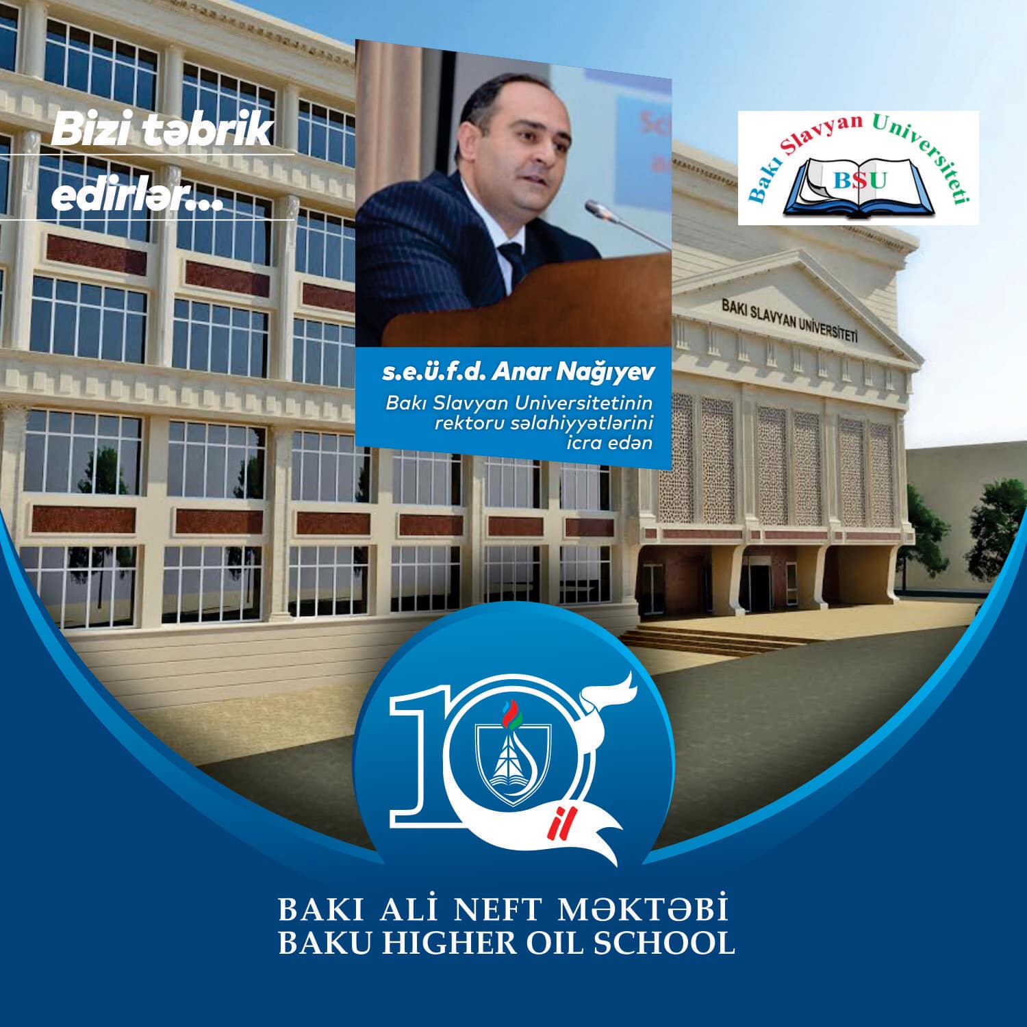 Bakı Ali Neft Məktəbinin (BANM) 10 illik yubileyi münasibətilə Bakı Slavyan Universitetinin rektoru səlahiyyətlərini icra edən, siyasi elmlər üzrə fəlsəfə doktoru Anar Nağıyev təbrik məktubu göndərib.Təbrikə görə hörmətli Anar müəllimə təşəkkür edirik.