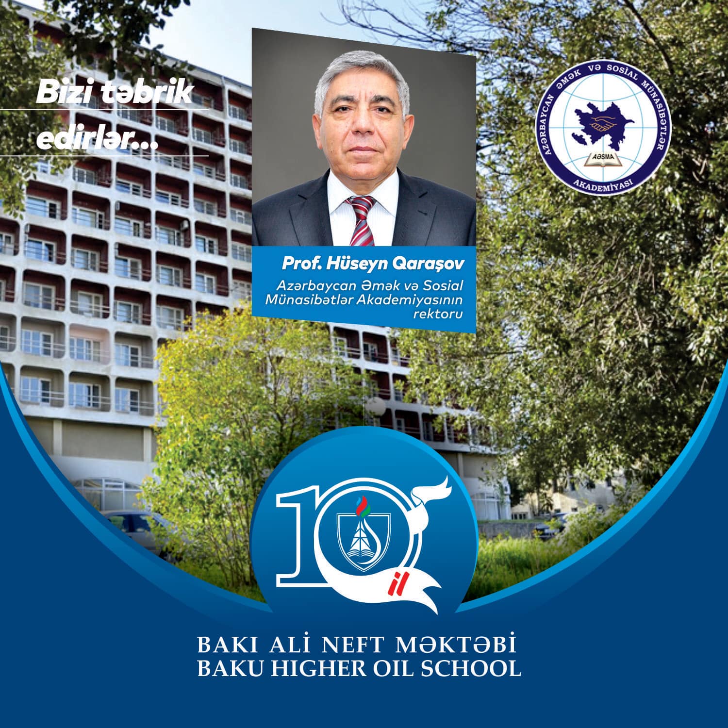 Bakı Ali Neft Məktəbinin (BANM) 10 illik yubileyi münasibətilə Azərbaycan Əmək və Sosial Münasibətlər Akademiyasının rektoru, professor Hüseyn Qaraşov təbrik məktubu göndərib.Təbrikə görə hörmətli rektora təşəkkür edirik.