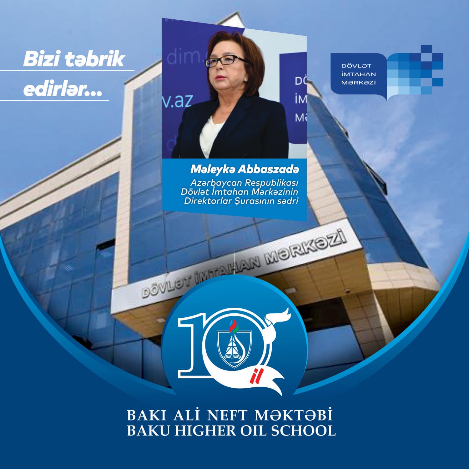 Bakı Ali Neft Məktəbinin (BANM) 10 illik yubileyi münasibətilə Azərbaycan Respublikası Dövlət İmtahan Mərkəzinin Direktorlar Şurasının sədri Məleykə Abbaszadə təbrik məktubu göndərib.Təbrikə görə hörmətli Məleykə xanıma təşəkkür edirik.