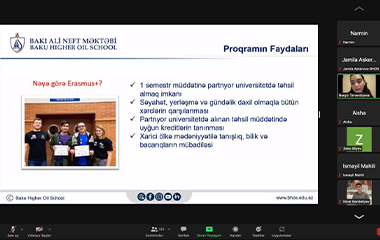 Vebinar çərçivəsində Ali Məktəbin Erasmus+ proqramı ilə əməkdaşlığı, mübadilə proqramlarına müraciət qaydaları, seçim mərhələsi və əməkdaşlıq etdiyi universitetlər haqqında məlumatlar verilib və tələbələrin sualları cavablandırılıb.