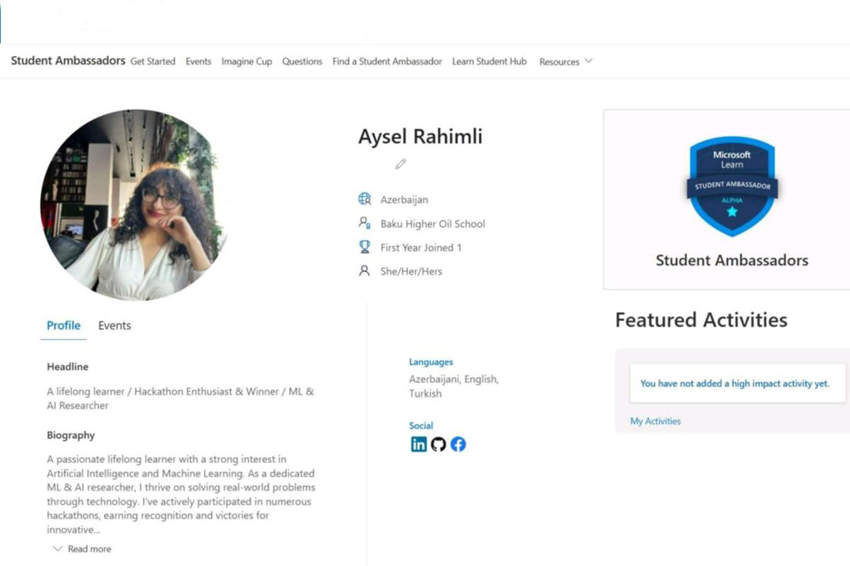 Aysel “Microsoft Learn for Educators” proqramına müraciət edərək, müvafiq mərhələləri uğurla keçib. Bununla yanaşı, “The Microsoft Learn Student Ambassadors” (MLSA) proqramına seçilib.