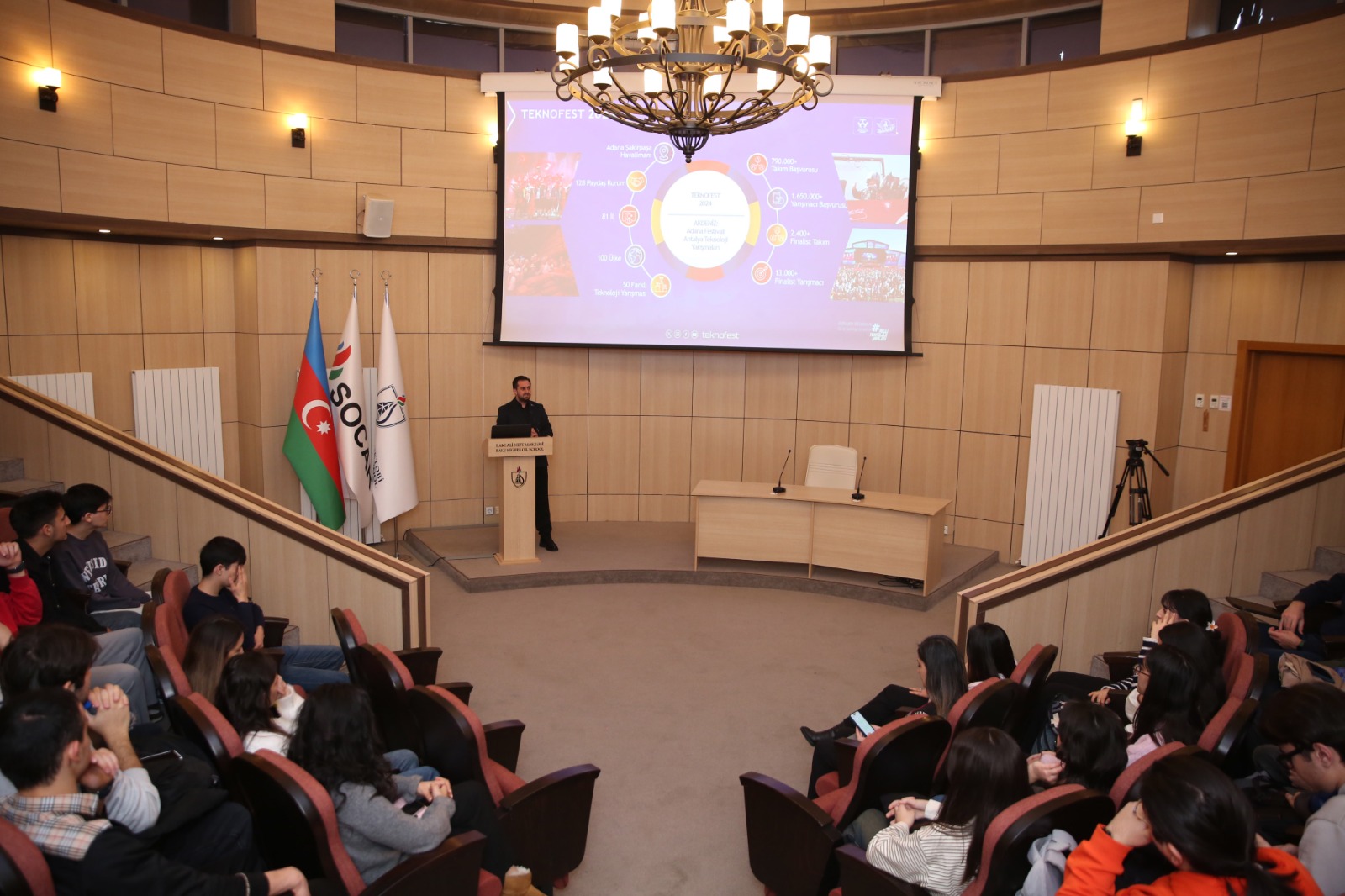 Daha sonra Ahmet Kösenin təqdimatında “TEKNOFEST 2025” haqqında infosessiya keçirilib. Tədbirdə festivalın müraciət prosesi, mövcud yarışlar və digər vacib məqamlar barədə ətraflı məlumat verilib, həmçinin tələbələrin sualları cavablandırılıb.