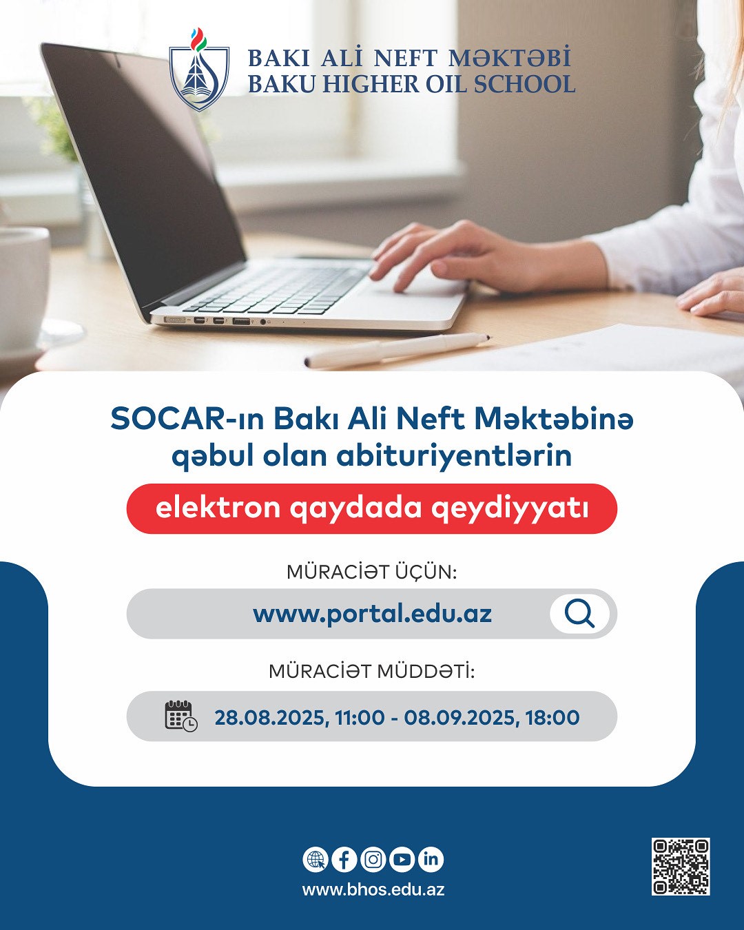 BANM-ə bakalavriat səviyyəsi üzrə qəbul olan tələbələr 28 avqust saat 11:00-dan 8 sentyabr saat 18:00-dək https://portal.edu.az/ sistemindən elektron qaydada qeydiyyatdan keçməlidirlər.