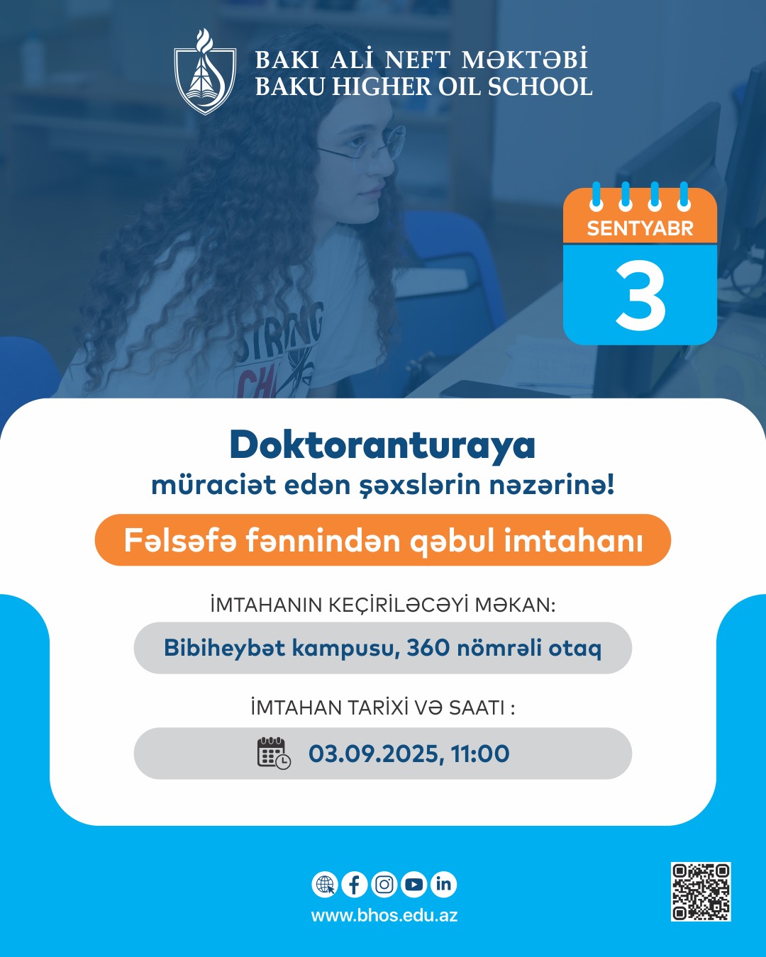 SOCAR-ın Bakı Ali Neft Məktəbində fəlsəfə doktoru proqramı üzrə Fəlsəfə fənnindən qəbul imtahanı 3 sentyabr 2025-ci il tarixində, saat 11:00-da Ali Məktəbin kampusunda yerləşən 360 nömrəli otaqda keçiriləcəkdir.