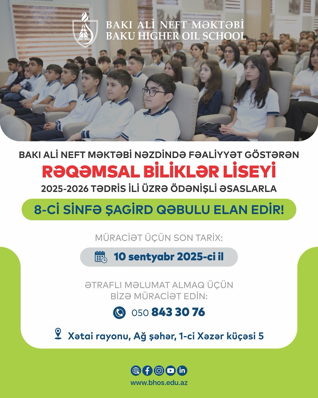 2025-2026 tədris ili üçün ödənişli əsaslarla 8-Cİ SİNFƏ ŞAGİRD QƏBULU ELAN EDİR!