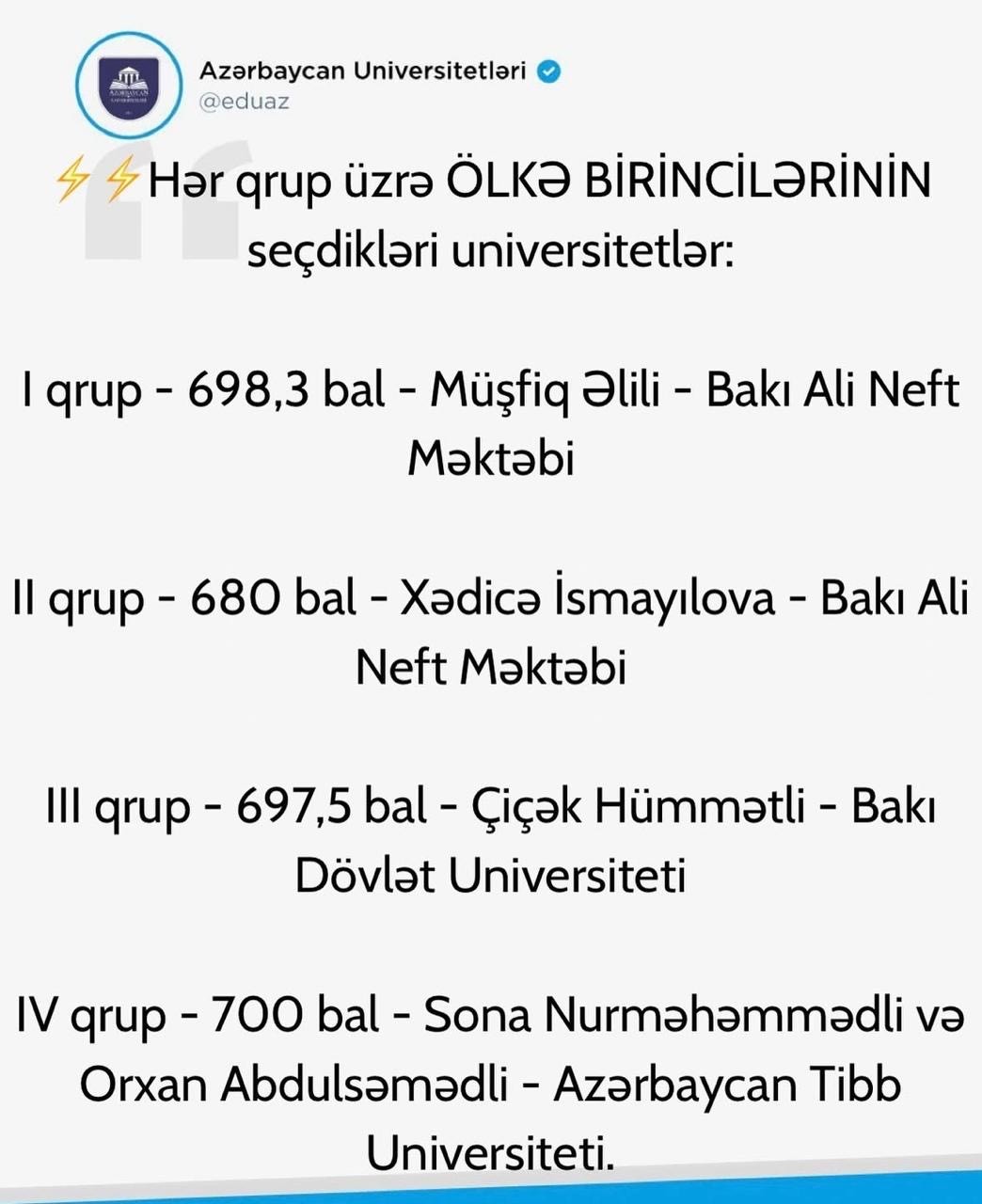 Hər qrup üzrə ÖLKƏ BİRİNCİLƏRİNİN seçdikləri universitetlər: